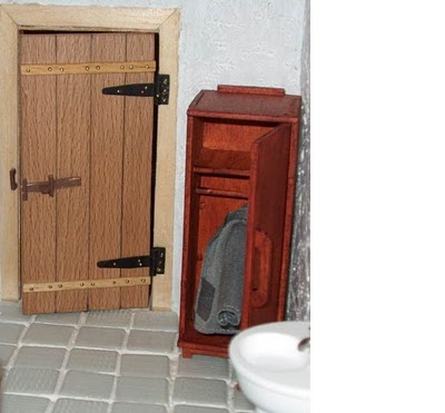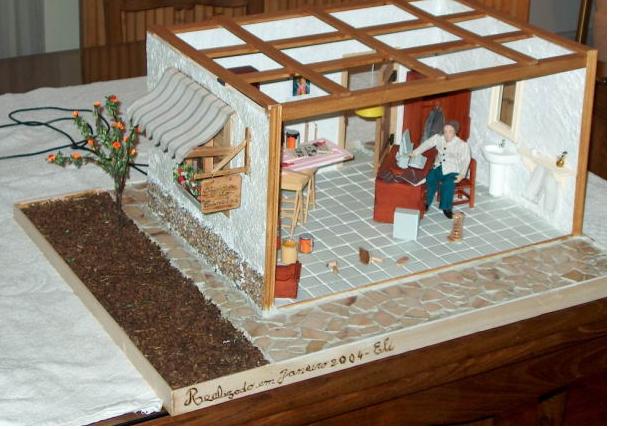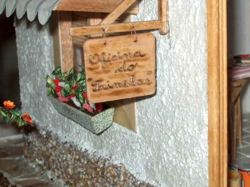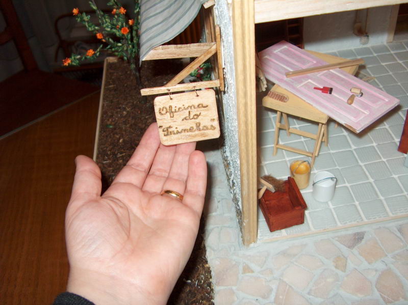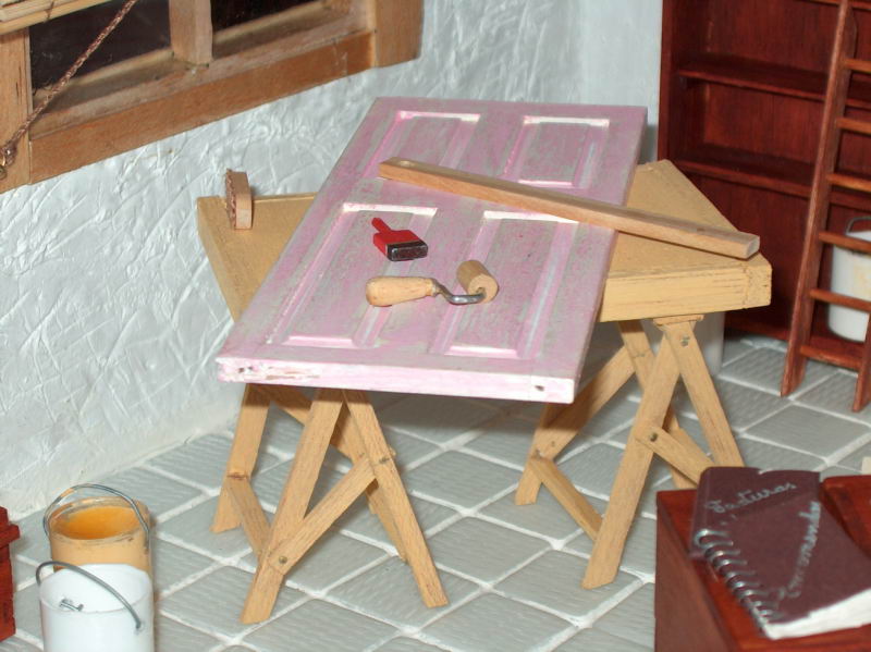 Recorri, igualmente a um modelo da "Miniaturas" a fim de fazer os cavaletes da bancada de trabalho, sobre a qual se encontra uma porta que o dono da oficina deverá restaurar.