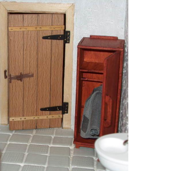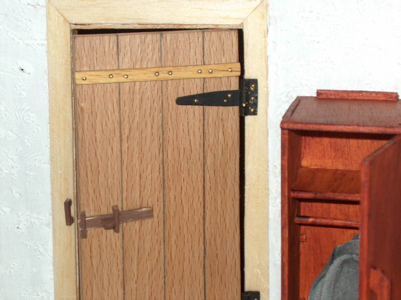 A porta foi feita com tábuas soltas e, posterirormente, ligadas entre si. As dobradiças foram feitas, manualmente, bem como a lingueta do fecho que funciona, na verdade.