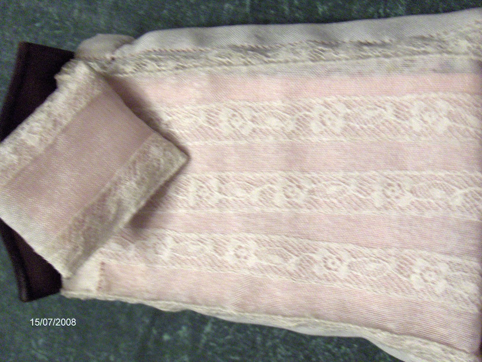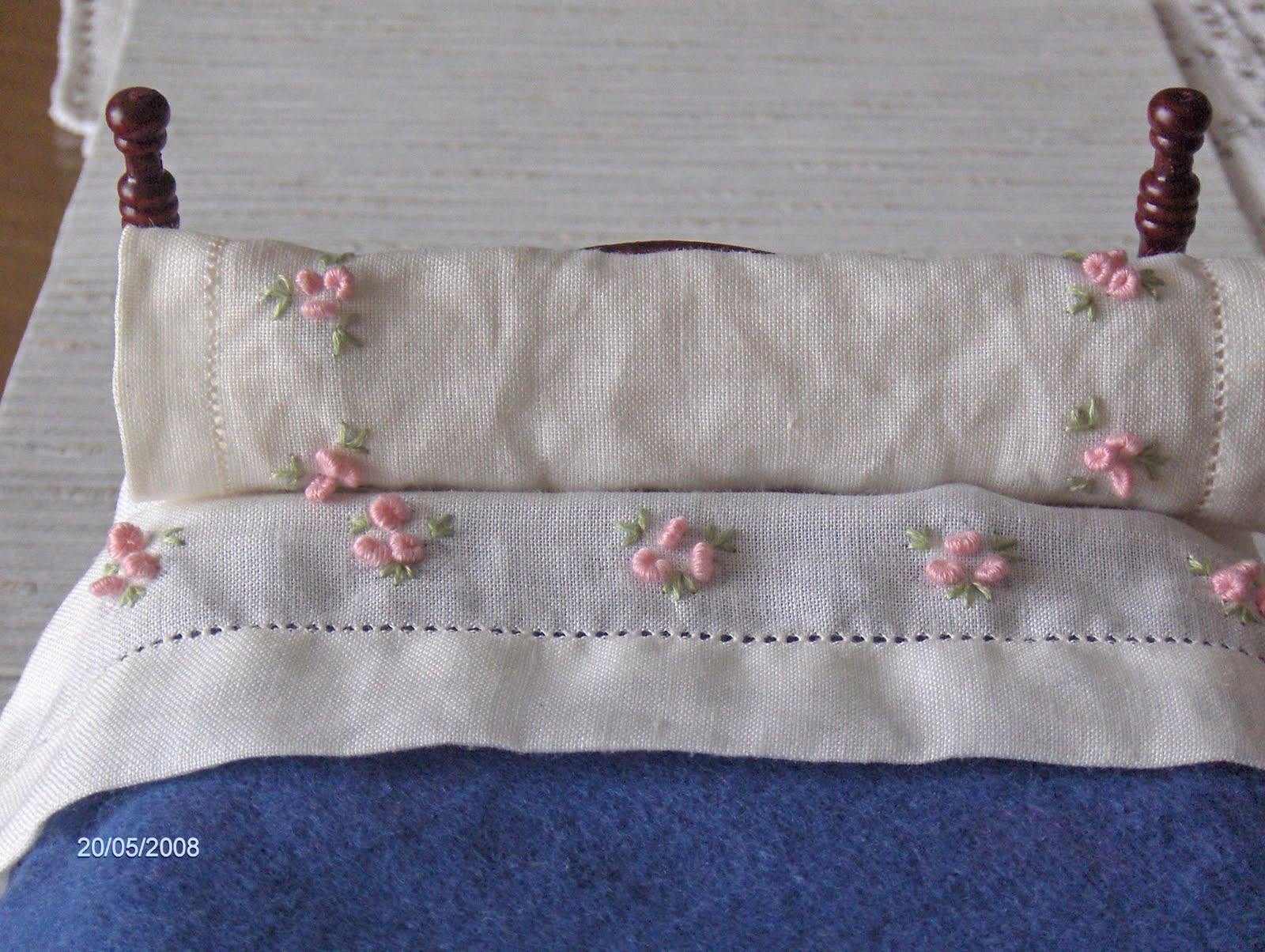 O conjunto da cama foi enfeitado com bainhas abertas e pequenas flores bordadas em Ponto Rococó. Falta fazer almofadas, cortinas, cortinados, uma colcha da cama.