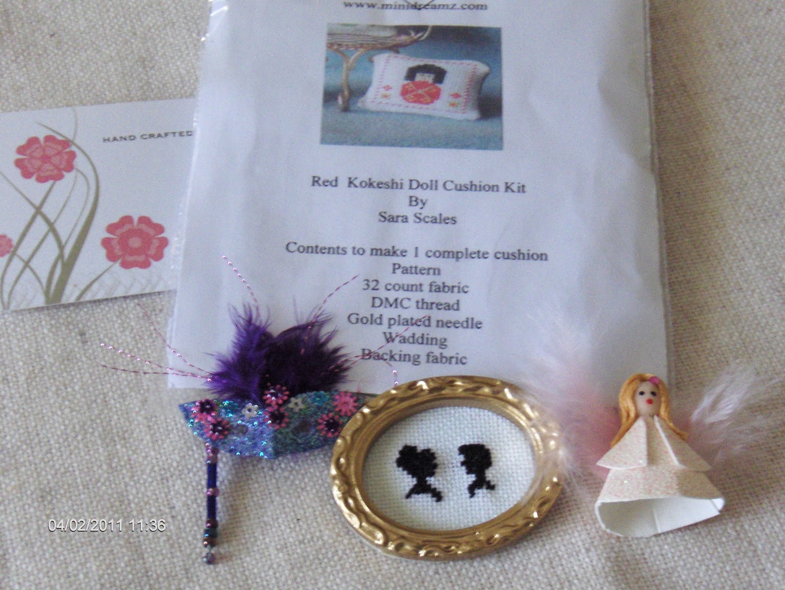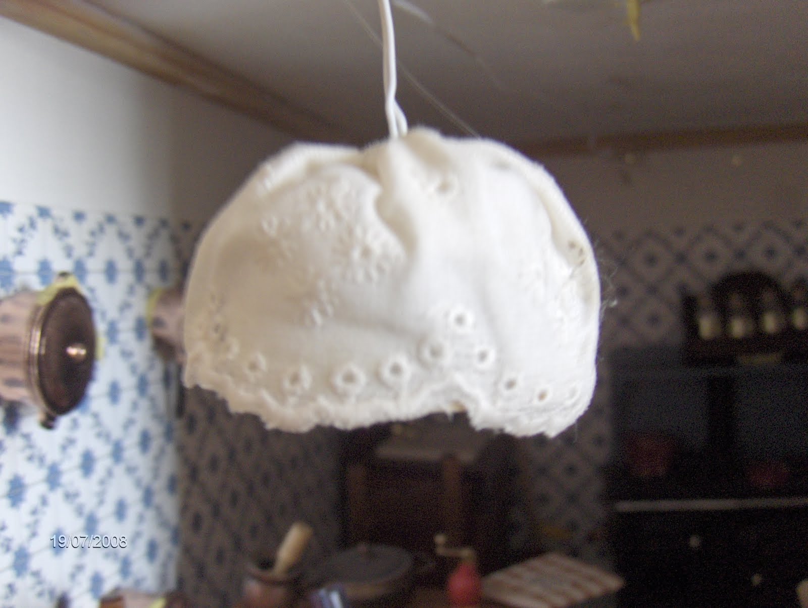 The tablecloth and curtains were made by me and the lamp made with half ping-pong ball covered with embroidered English.